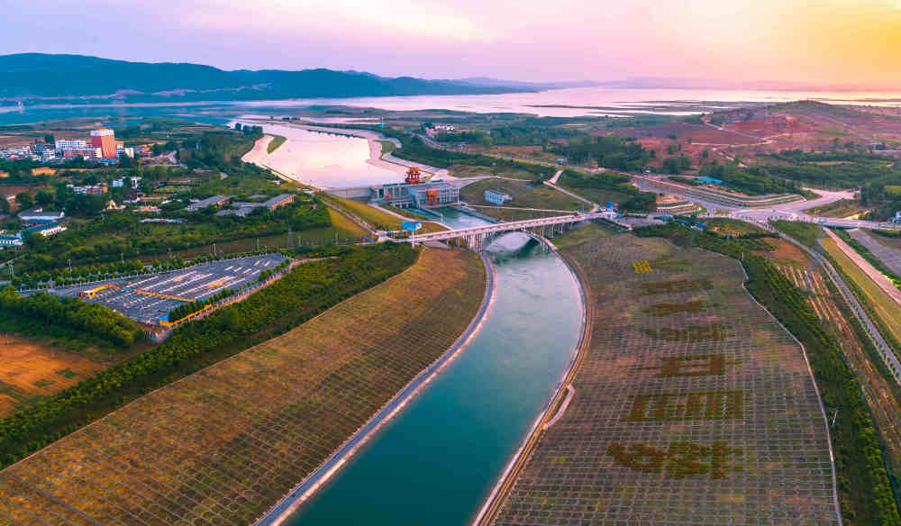 图为南水北调中线工程陶岔渠首,上游通过引水渠与丹江口水库相连,下游与南水北调中线干渠连接。