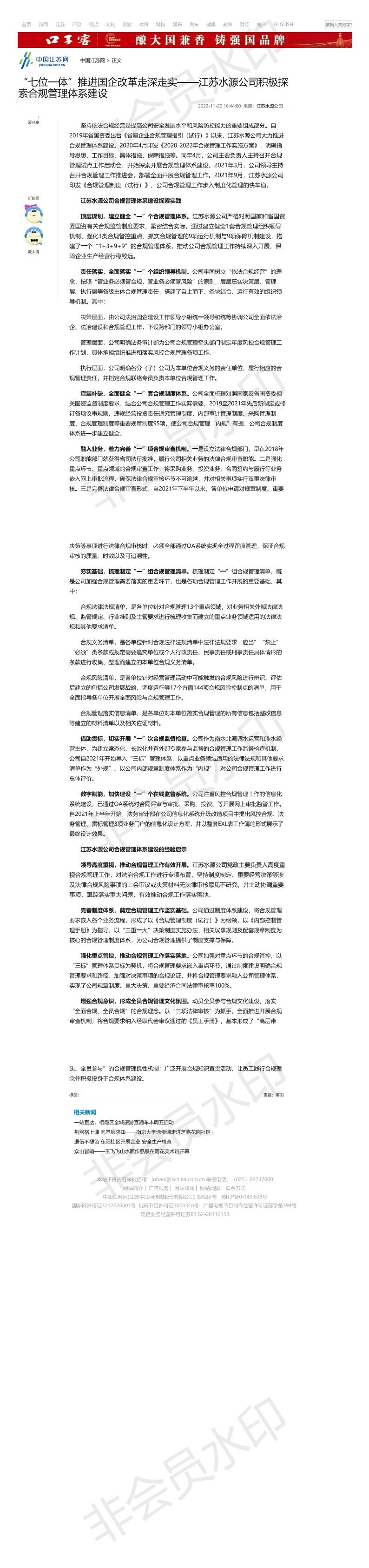 中国江苏网、新江苏网:“七位一体”推进国企改革走深走实——江苏水源公司积极探索合规管理体系建设