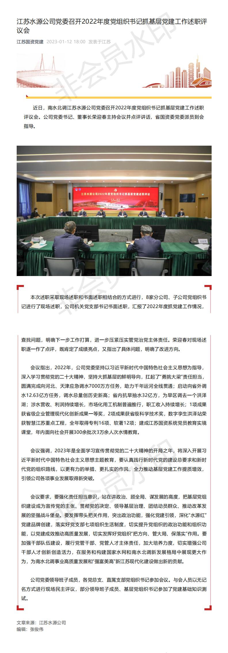 江苏国资党建——江苏水源公司党委召开2022年度党组织书记抓基层党建工作述职评议会