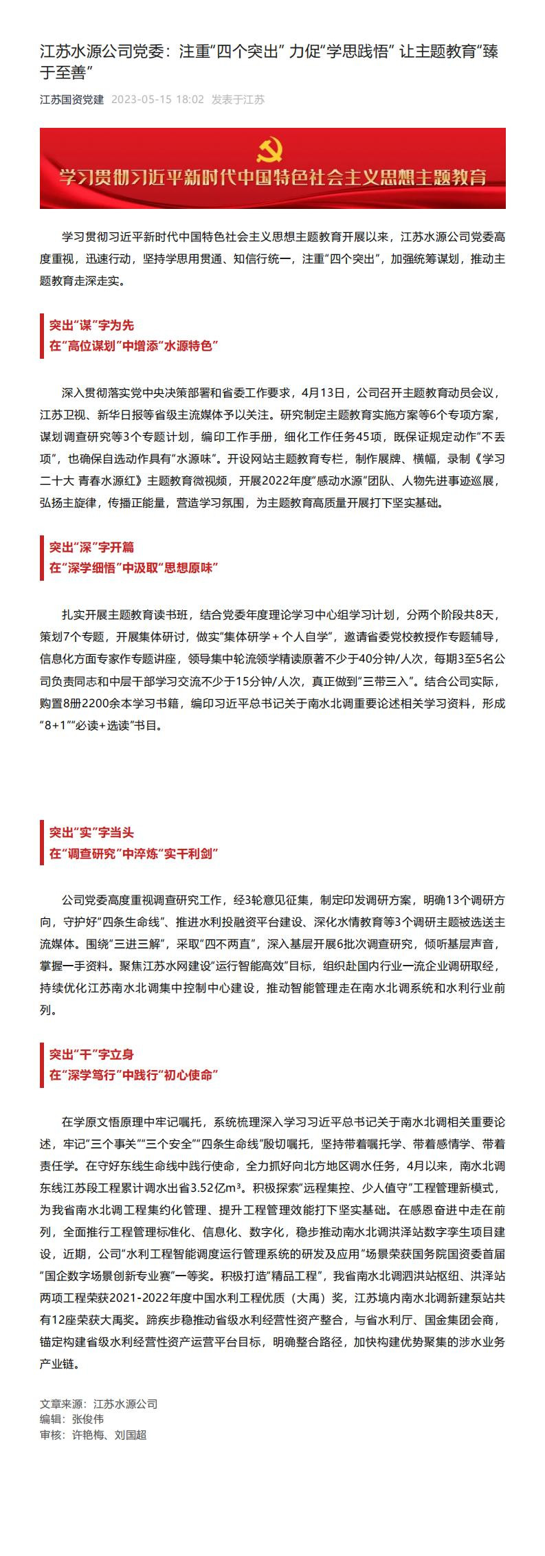 江苏国资党建、中国江苏网——江苏水源公司党委:注重“四个突出” 力促“学思践悟” 让主题教育“臻于至善”