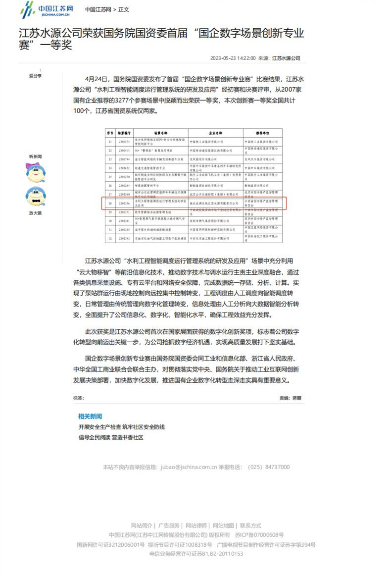 学习强国、中国江苏网——江苏水源公司荣获国务院国资委首届“国企数字场景创新专业赛”一等奖