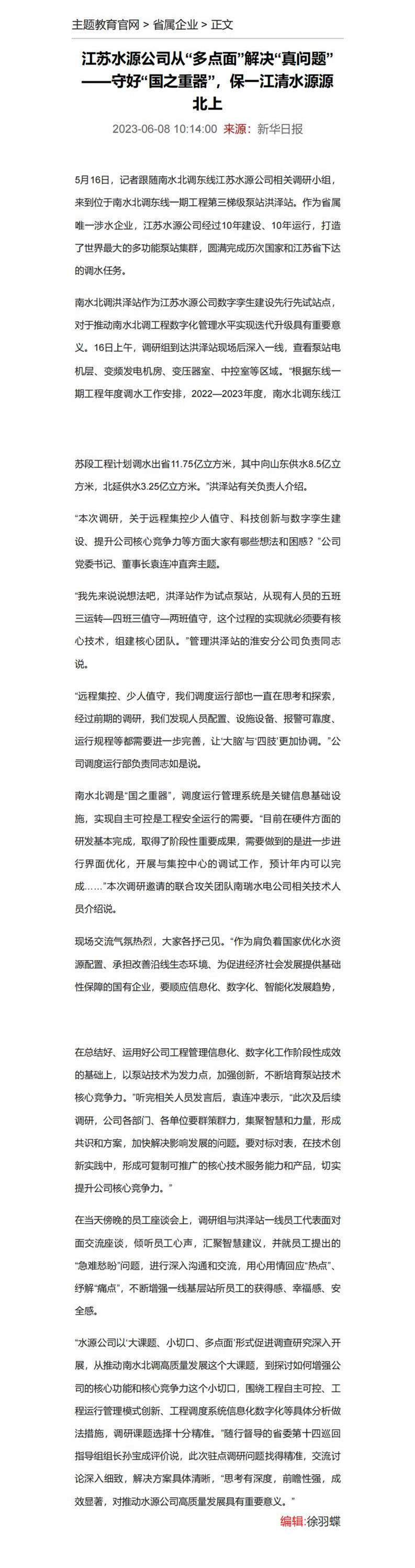 主题教育官网——江苏水源公司从“多点面”解决“真问题”——守好“国之重器”,保一江清水源源北上