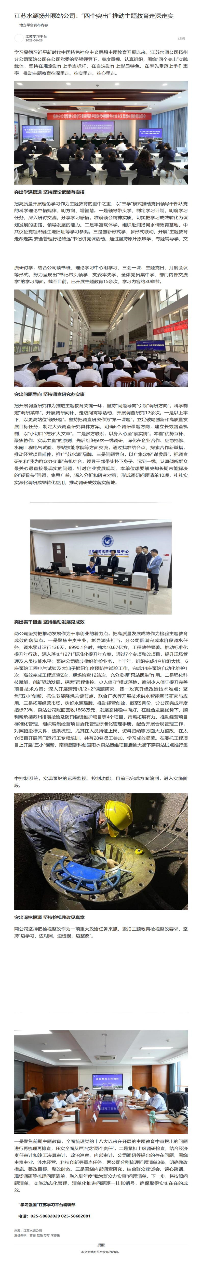 主题教育官网、学习强国、中国江苏网:江苏水源扬州泵站公司:“四个突出” 推动主题教育走深走实