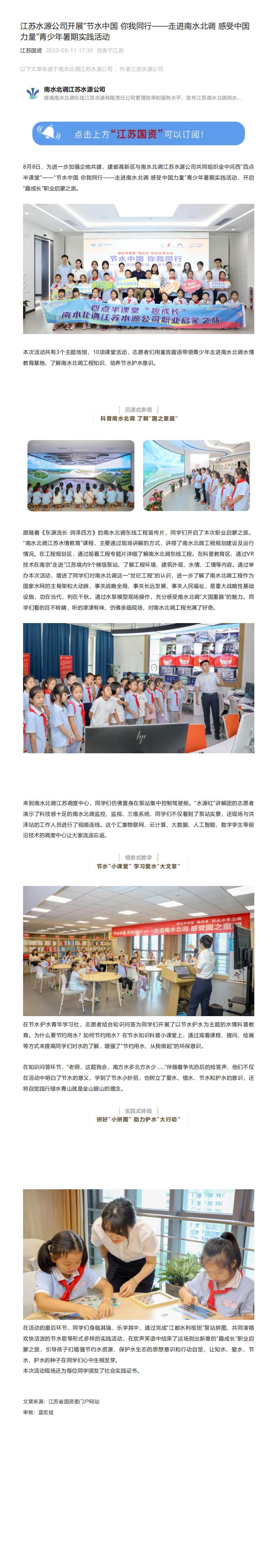 江苏国资、中国江苏网:江苏水源公司开展“节水中国 你我同行——走进南水北调 感受中国力量”青少年暑期实践活动