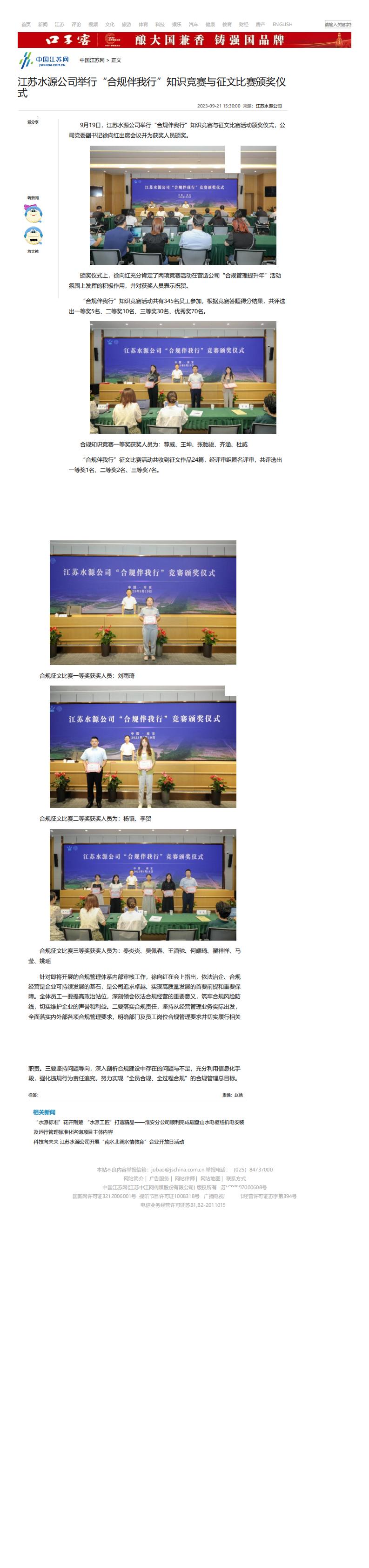 中国江苏网——江苏水源公司举行“合规伴我行”知识竞赛与征文比赛颁奖仪式