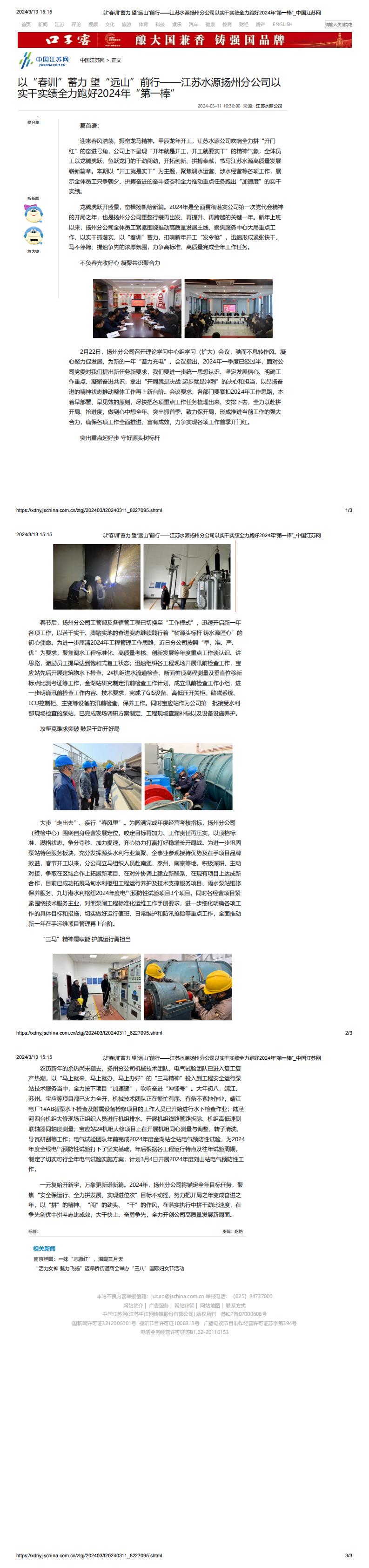 中国江苏网:以“春训”蓄力 望“远山”前行——江苏水源扬州分公司以实干实绩全力跑好2024年“第一棒”
