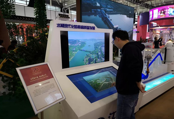 展厅总面积12000平方米,分为室外展、综合展和地方展三个展区。其中,综合展专题展区由“经济发展高质量”“改革开放高质量”“城乡建设高质量”“文化建设高质量”“生态环境高质量”“人民生活高质量”六个专题展区构成。“生态环境高质量”展区江苏水利专题展台,用触摸屏、视频、图片等,详细介绍了江苏水情、三大调水体系,还展出了江都水利枢纽第四抽水站模型、泵站智慧巡检机器人实物,内容丰富、形式多样,引得大家长时间驻足观看,不时发出赞叹,为江苏水利高质量发展成就点赞。