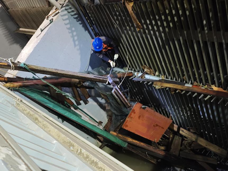 5月17日夜间,宝应站值班员发现下游出现大量废弃船板、铁皮和大块树干正沿潼河来水飘来,大型废弃物的进入一方面会加剧水草淤积,另一方面可能会撞损清污机,如不慎进入前池严重时会对主机组造成重大损坏。值班人员发现后及时将情况汇报带班领导,迅速组织清污人员和技术维修人员集结进行紧急险情处置,通过将聚集的各类废弃物进行分散,减轻集中处理的压力,对固定的大型树干铁皮进行分割,逐个击破。同时检修人员密切关注清污机运行情况,通过调整大型废弃物进入皮带机的角度严防进入前池,确保发现问题及时处置。18日凌晨,在全体人员的共同努力下,废弃船板、铁皮、树枝等杂物完全清理完毕,有效化解了此次险情。